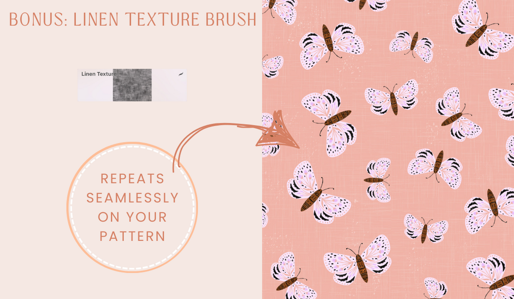 The Brush Library contains 8 Pattern Templates as stamp brushes and 11 Pattern Layouts and a bonus repeating linen texture stamp brush.